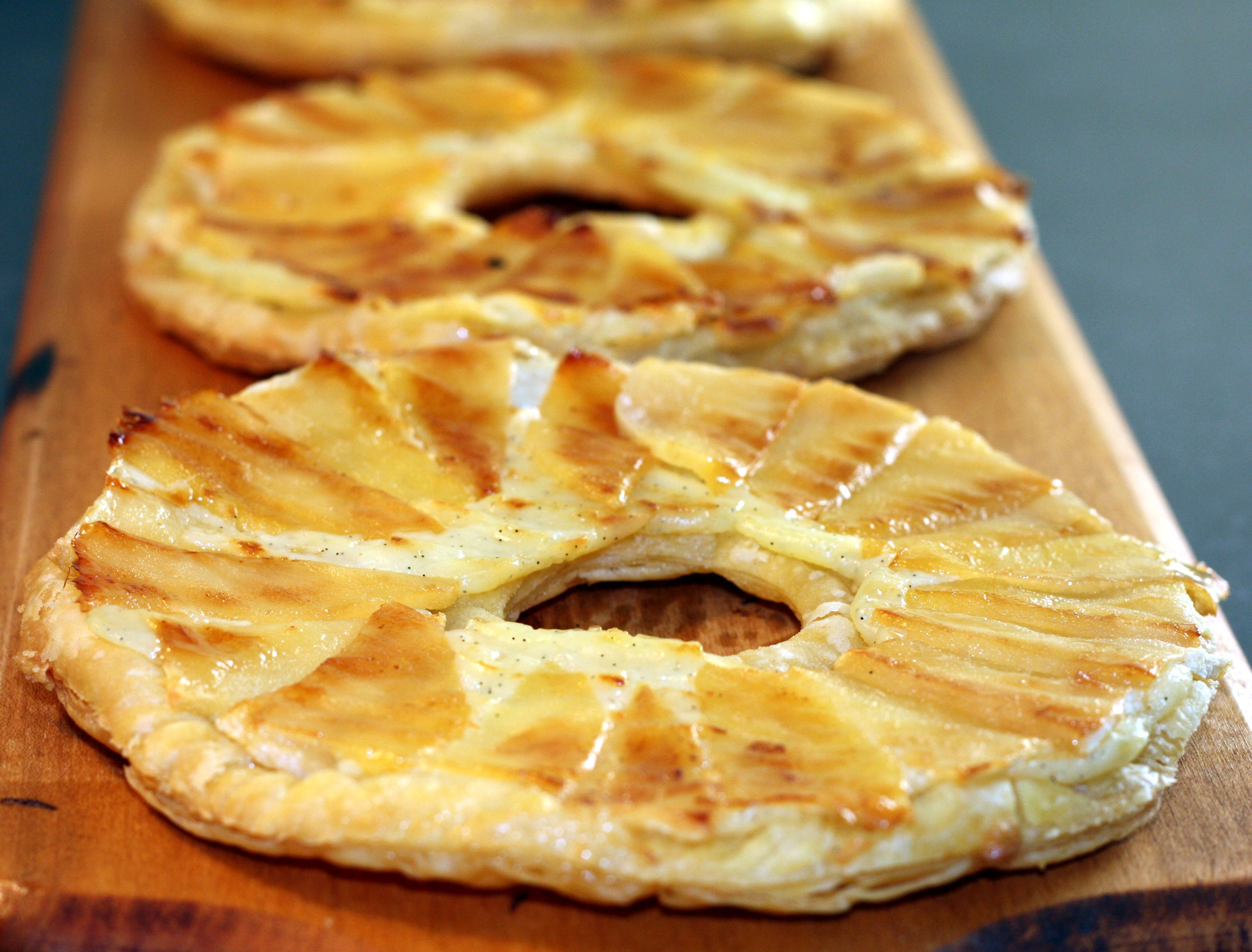 This was not simple. The hard part was putting together the tarts so that the apples were overlapped, but fit around the circle. Then after they cooked for a little while, I had to flip them over. You definitely need a giant sized spatula to make these the way the recipe reads – which fortunately I have. I would suggest making smaller rounds, without punching out the center. Then layer the apples in the center – in a couple of rows so that the pastry is pretty much covered, except for a ring around the exterior. You may need one more apple to make this work – and it would probably make 12 apple tarts instead of 8.