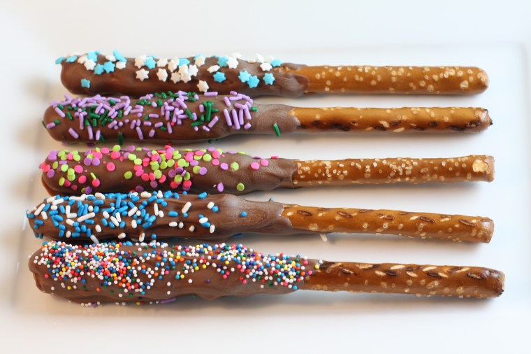I started making these a few years ago because my daughter loves sprinkles, and I thought this would be fun and easy to make around the holidays. The first year we just dipped them in chocolate, and then I let her go nuts with the sprinkles. The second year, I found an amazing hole-in-the-wall cake/candy store, where you can buy big hunks of caramel. It is basically like buying a giant one of these. I sliced the caramel very thin, and then wrapped a piece around the top of a pretzel rod, very carefully. Then, I dipped them in chocolate and let her go nuts with the sprinkles. They were amazing!!! Now my friends and neighbors feel like they have to remind me that they are looking forward to the pretzel rods every year – just so I am sure to make them.