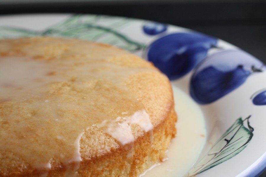 When the cake is thoroughly cooled, combine the lemon juice and powdered sugar in a small bowl and spoon it gently over the cake. The glaze will be thin and will soak in like a syrup.