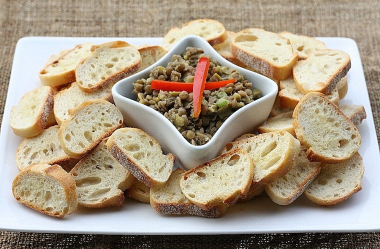 For a printer-friendly version of this recipe, please click here: Crostini with Lentil and Green Olive Salad