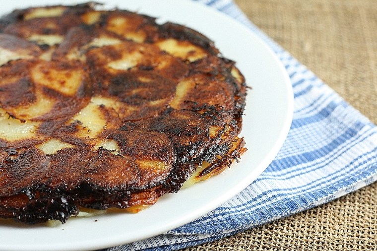 Ok, I know what you are thinking – and it is not true.  I’m sure you have heard this phrase before, and I just have to repeat it – don’t judge a book by it’s cover.  Don’t – definitely not this time, because this potato galette was the best freakin’ potato dish I have ever made in my life.  I swear.  I know it doesn’t look pretty, and you may even be thinking it looks burnt – but it was perfect.  Let me tell you about it…
