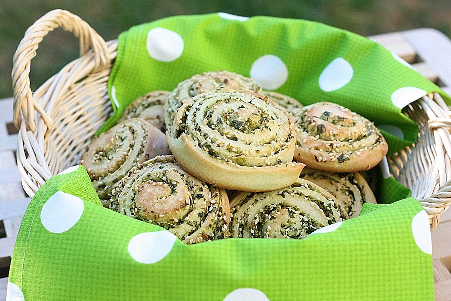 I am excited to start experimenting with what I learned…but in the meantime, I will post this fabulous recipe that I found in Bon Appetit.  These were quite easy and quick to make, for a yeast recipe that is, and they were delicious.  The girls both loved them, which was really amazing – since they pretty much stay away from anything green these days.  I will definitely be making these again, and next time I will take an even more striking picture…let’s hope anyway!