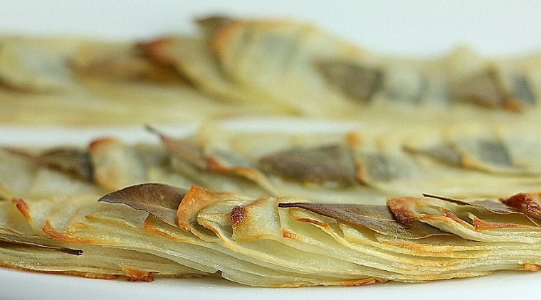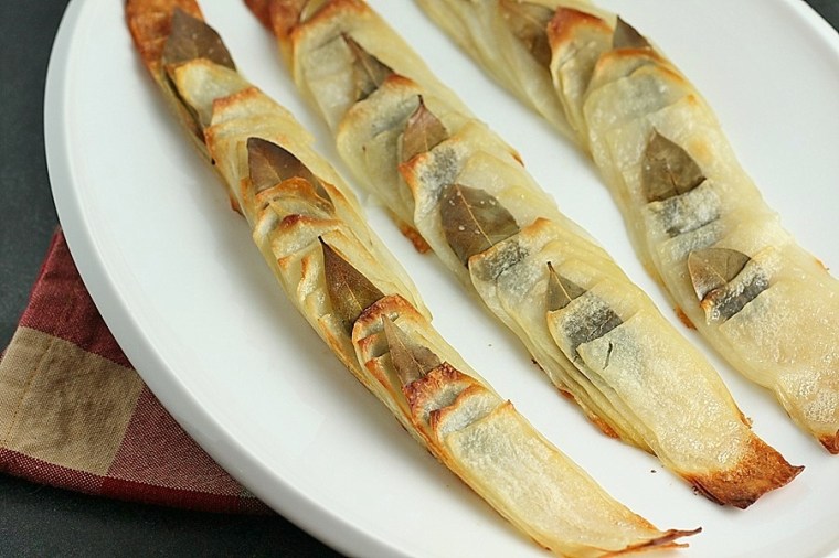 Re-form slices from each potato into a stack. Place in prepared dish, fanning apart slightly like a deck of cards. Insert bay leaves between potato slices at even intervals. Season with salt and drizzle with