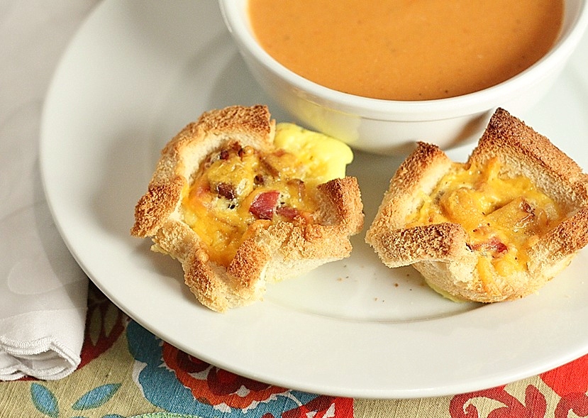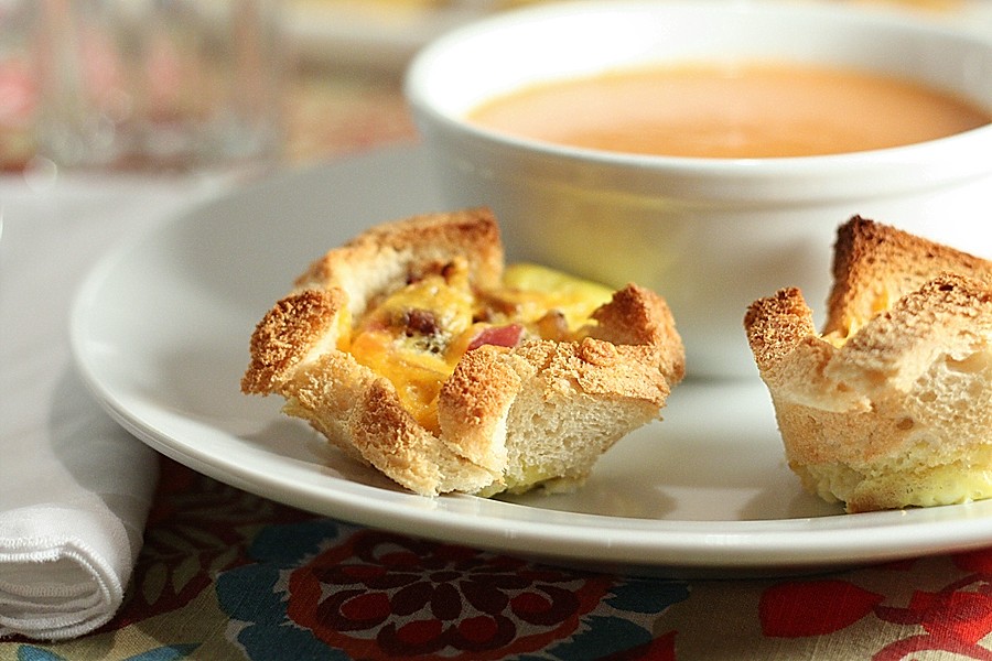 Lightly coat both sides of bread with cooking spray. Press each bread slice into the cup of a muffin tin. Bake at 425° for 10 minutes or until bread is lightly toasted. Cool slightly.