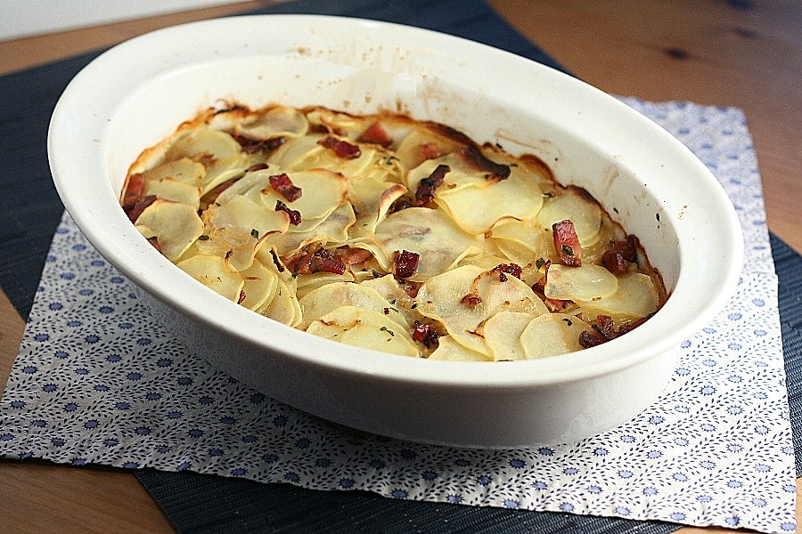 For a printer-friendly version of this recipe, please click here: French Potato Casserole with Bacon and Caramelized Onion