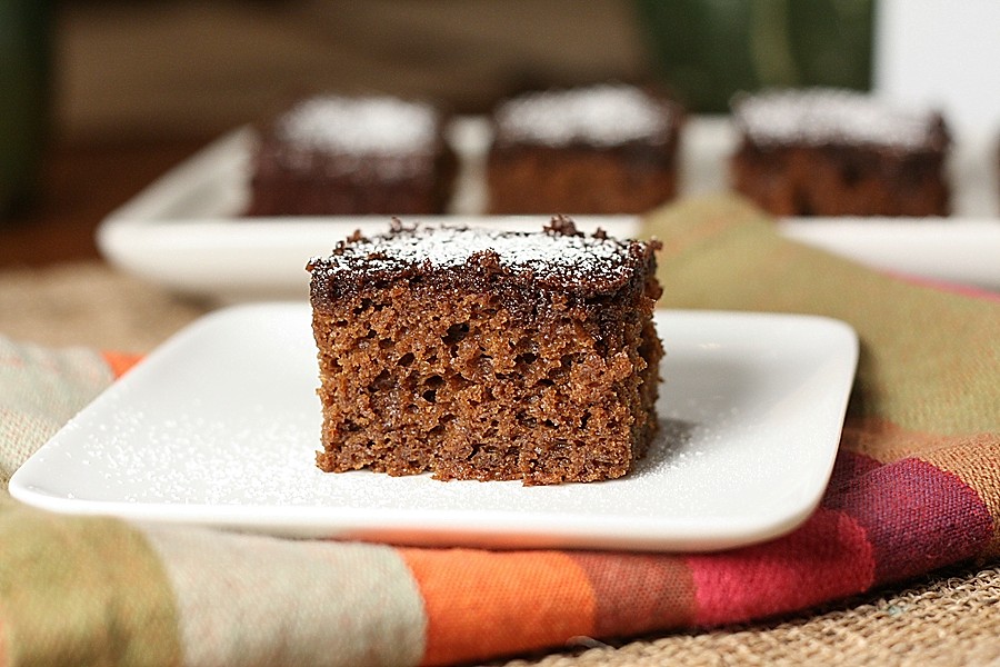 Pour batter into pan. Bake at 400° for 25 minutes. Place on a rack; pierce surface with a skewer. Combine 1 tablespoon honey, 1 tablespoon molasses, and 1 tablespoon water; brush over hot cake. Cool. Dust with powdered sugar.