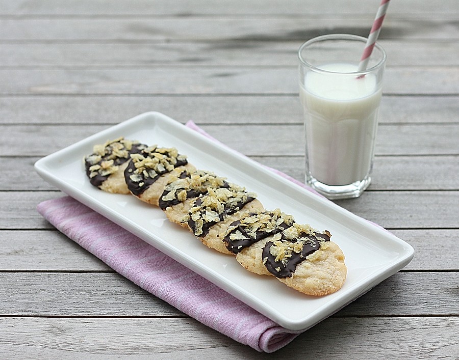 So what exactly is normal anyway?  I certainly don’t operate under normal conditions in any part of my life – particularly when it comes to food.  For those of you who follow this blog, you know I love a good twist on a recipe – candy sushi and meatloaf cupcakes are just a few of my favorites.  So – when my best friend from high school sent me this recipe for Potato Chip Cookies that she got from The Chew – even among all the craziness in my life the past couple of weeks – I just couldn’t put off making them.  Of course, I cut corners when it came to taking this picture, but I had to simplify somewhere, right?  These cookies were something else – and they got better the longer they sat – they were like a salty sweet shortbread cookie that was perfectly crunchy.  You either couldn’t live with the dark chocolate side, or you couldn’t live without it – I had both reactions from people.  Either way, this recipe is definitely a keeper.