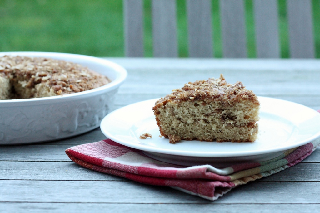 Last weekend she wanted to make sure she had something easy to eat for breakfast in the morning. She found this recipe in Cooking Light – and was planning to make it for herself. Unfortunately homework got in the way – so I decided to help her out (I know, twist my arm) – as I was making it though, she ran into the kitchen to remind me to make sure the coffee cake had lots of cinnamon. I told her that the recipe had nutmeg instead – to give it that eggnog flavor – that’s where she drew the line. She didn’t want that – she wanted a cinnamon coffee cake – that’s what she is used to. This coffee cake was delicious – nice and moist, with lots of flavor. Cinnamon or nutmeg, you can’t go wrong. Again, change can be hard at times – and if this is the only change she wants to resist – I am completely supportive.