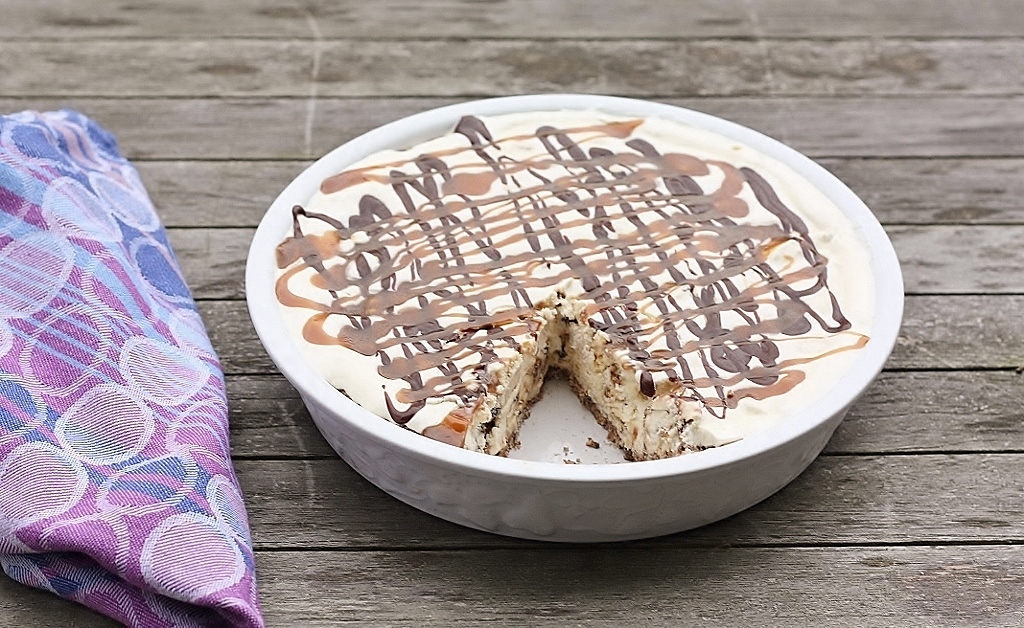 Put the pie together. Add the ice-cream to the pie pan with the cooled crust – spreading evenly on top. Soften the fudge sauce and caramel in the microwave, and drizzle on top of the pie. Put back in the freezer until you are ready to serve. Let the pie sit on the counter for about 10 minutes before serving so it is easier to cut.