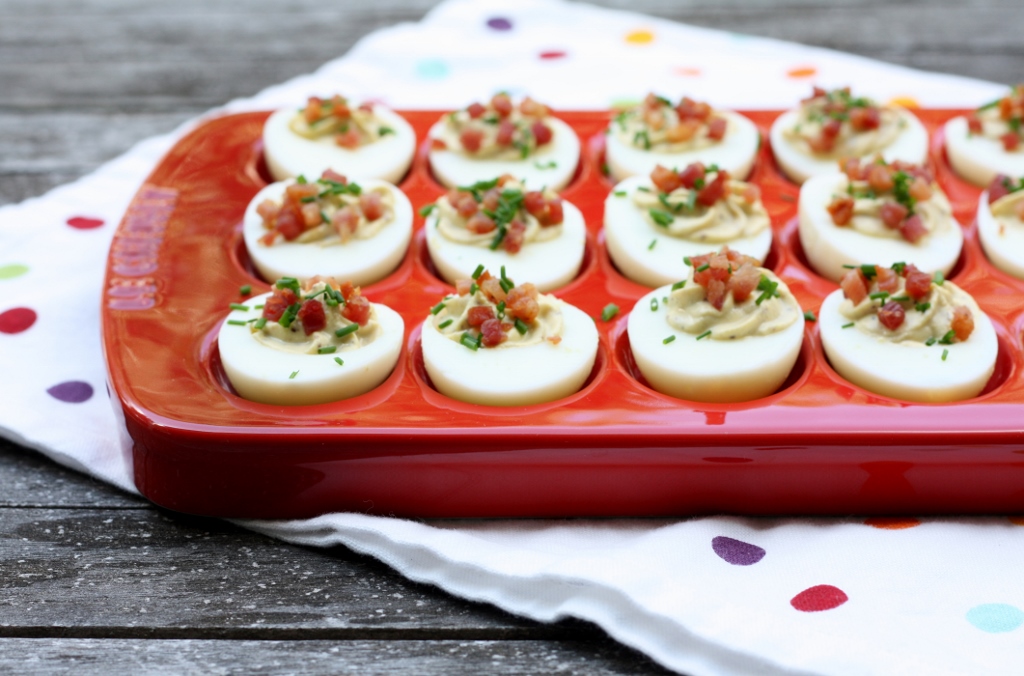 This month’s awesome opportunity from Stonyfield Farms was just too good to be true.  I feel like I have every kitchen gadget and serving dish that anyone could want – although there was always the missing egg tray.  I love making deviled eggs, but I just never saw the absolute need to get one.  You can find many deviled egg recipes on this blog, with pictures either taken on a regular tray or a slightly interesting shape – but none on a traditional egg tray.  When Le Creuset sent this deviled egg platter – I was beside myself.  But wait, there was more – I also received some amazing kitchen tools from Kitchen IQ.  Some stackable measuring spoons, and cutting boards.  These very flexible cutting boards have a non-slip surface underneath – shear genius. I have been using flexible cutting boards for a while, but I always have to add a non-slip mat underneath so they don’t slide all around.  Both of those came in handy when making these eggs – and now those cutting boards are the ones I go to first when I start chopping.